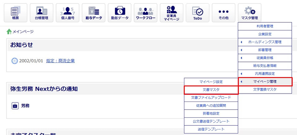 - [マスタ管理]>[マイページ管理]>[文書マスタ]をクリックします。