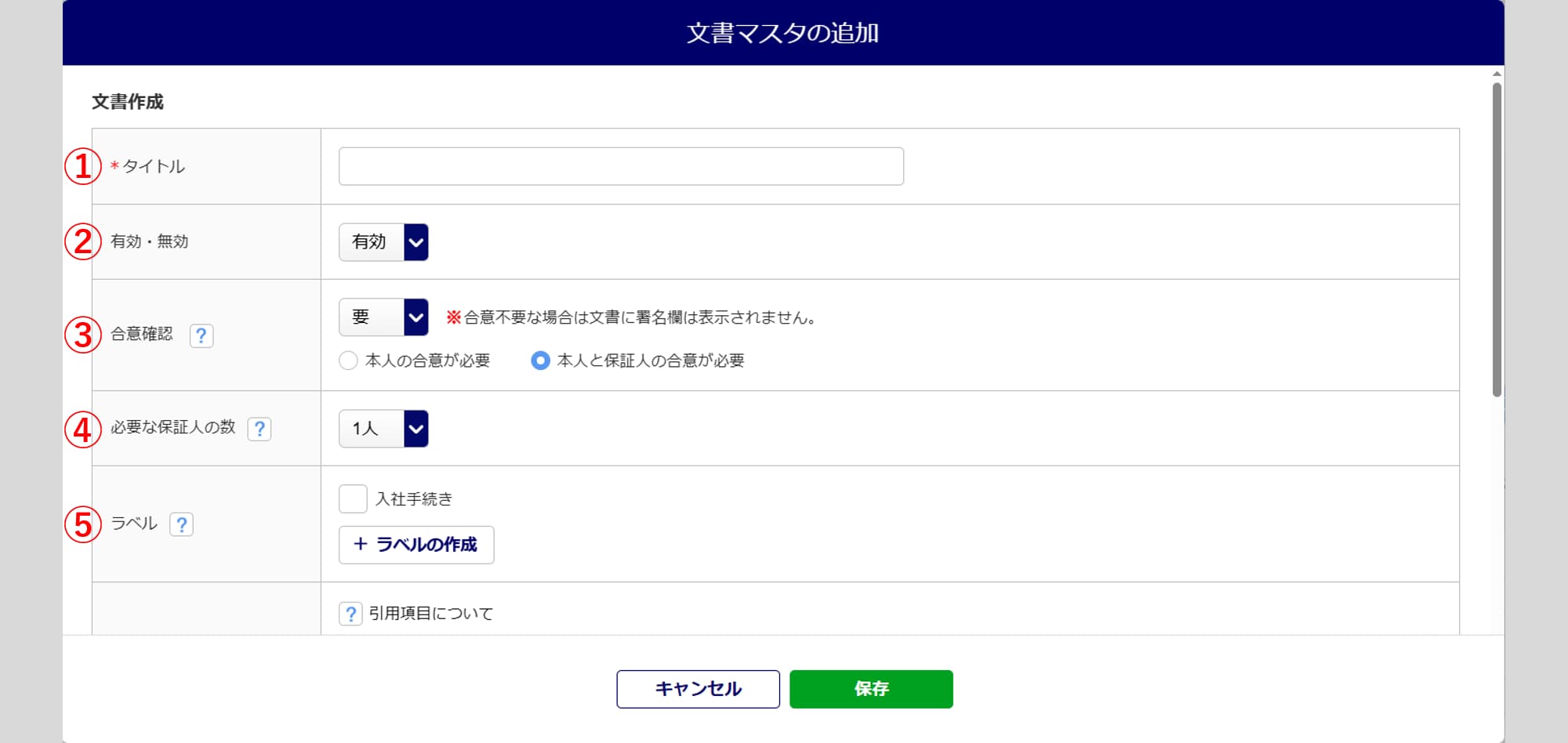No. 項目名 説明 ① タイトル 文書のタイトルを設定します。必須項目です。 ② 有効・無効 「有効」を設定した場合、作成した文書マスタをタスク発行時に選択できるようになります。「無効」を設定すると、タスク発行時に選択できません。 ③ 合意確認 従業員の合意の要・不要を選択します。「要」を選択した場合、従業員本人に加えて身元保証人の合意が必要か否かを選択します。 ④ 必要な保証人の数 「③合意確認」に「要」、「本人と保証人の合意が必要」を選択した場合に表示されます。必要な身元保証人の数を「1人/2人」から選択します。設定した数の身元保証書が発行されます。 ⑤ ラベル 文書に任意のラベルをつけて分類することができます。一つの文書に対して複数のラベルをつけることができ、文書の管理が便利になります。ラベルをつけることで入社手続き発行時に文書をまとめて選択することができます。 - 「文書内容」を設定します。