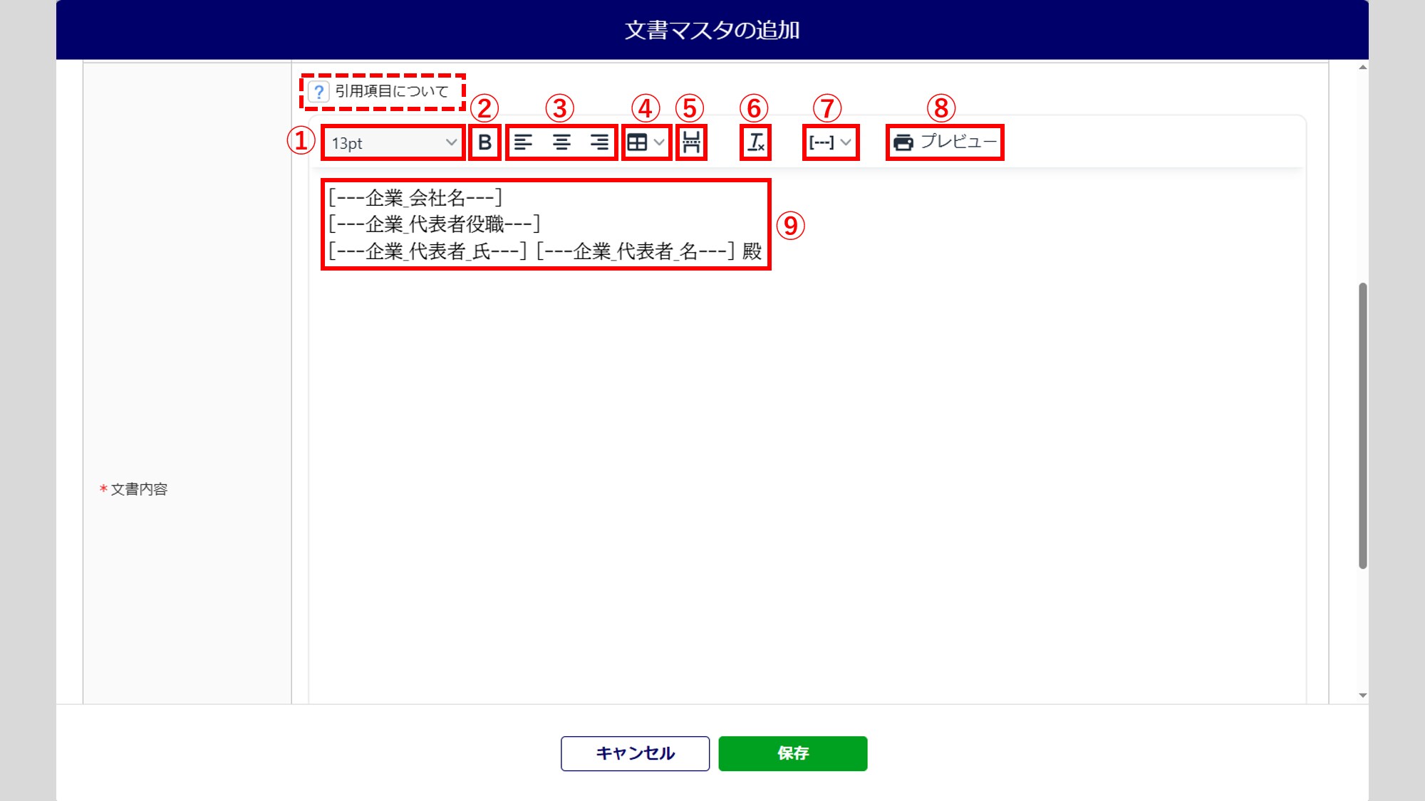 詳細については、[?(はてなマーク)](赤破線部分)をご参照ください。⑧ プレビュー クリックすると、作成中の文書マスタをプレビュー画面で確認できます。 ⑨ 企業情報の変数 プレビューおよびPDF作成時に[マスタ管理]>[企業設定]の情報と置き換えます。 - 各項目の設定後、[保存]をクリックします。