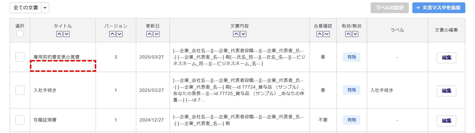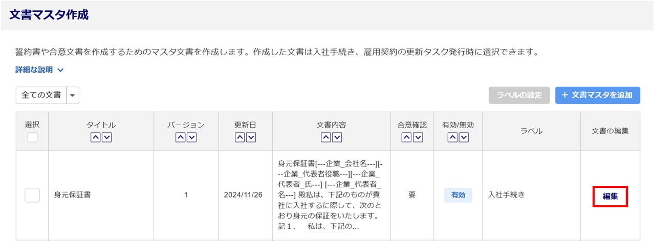登録済みの文書を編集する場合、対象の文書の「文書の編集」列の[編集]をクリックし、編集をおこないます。編集方法の詳細については、本マニュアル内「各項目の設定」をご参照ください。