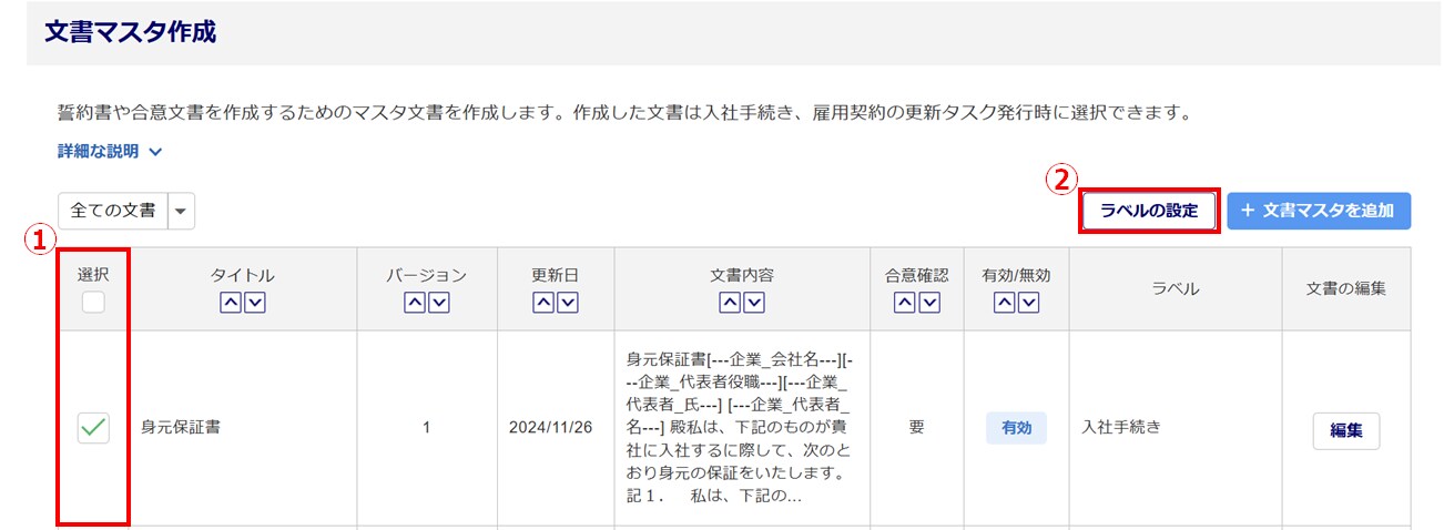 - ラベルの付け外しやラベルの編集をする場合、対象の文書の「選択」列(①)にチェックし、[ラベルの設定](②)をクリックします。