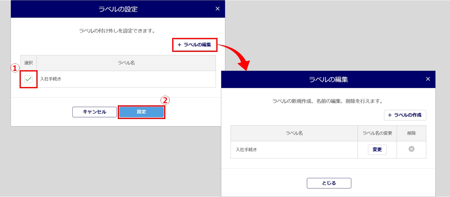 - ラベルの付け外しをおこなう場合は、対象のラベルの「選択」列(①)にチェックし、[設定](②)をクリックします。ラベルの編集・変更・削除をおこなう場合は、[ラベルの編集]をクリックし、「ラベルの編集」ウィンドウにて編集をおこないます。