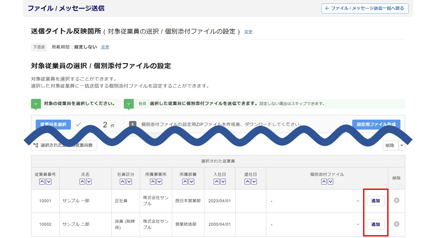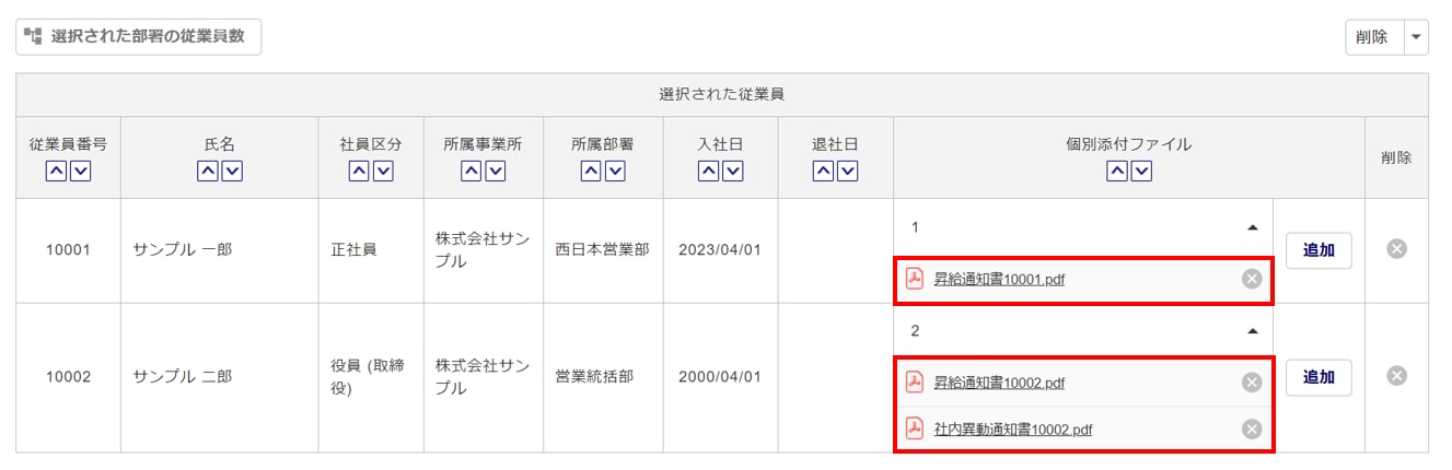 - 従業員ごとに「個別添付ファイル」列の[追加]をクリックし、添付ファイルを選択します。