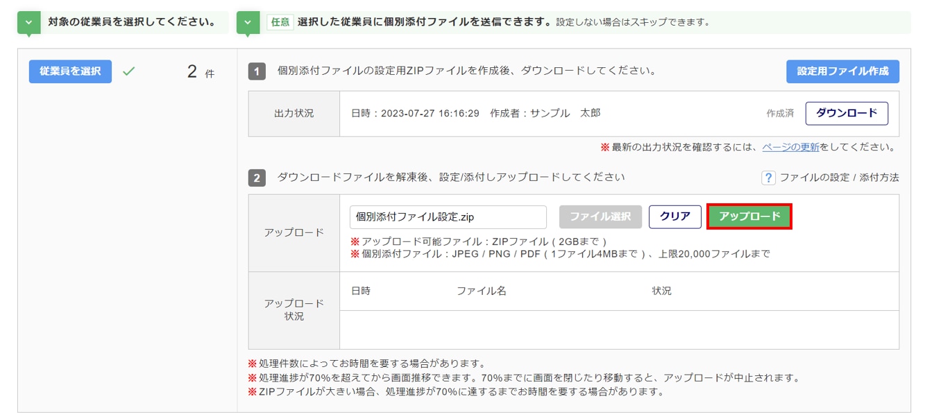 対象従業員を選択後、従業員ごとに添付ファイルを個別に設定します。