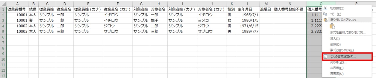「O列:個人番号」を選択、右クリックし、[セルの書式設定]をクリックします。