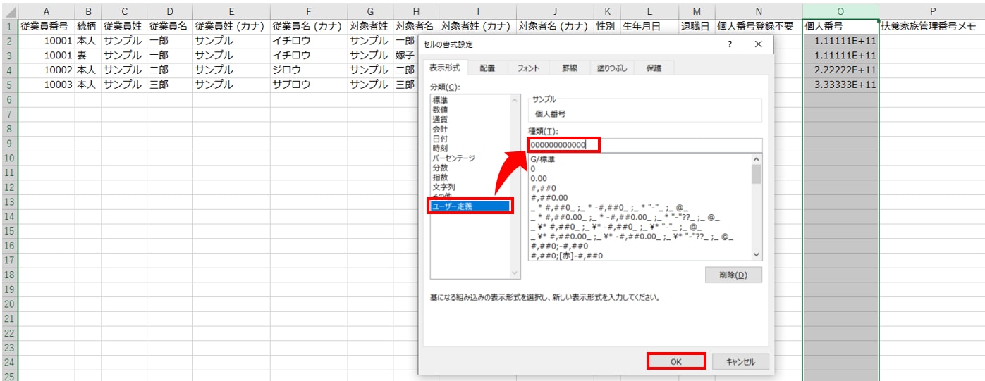 表示形式タブにて、「分類:ユーザー定義」>「種類」に「000000000000(0を12桁)」入力し、[OK]をクリックすると、個人番号が正しく表示されます。