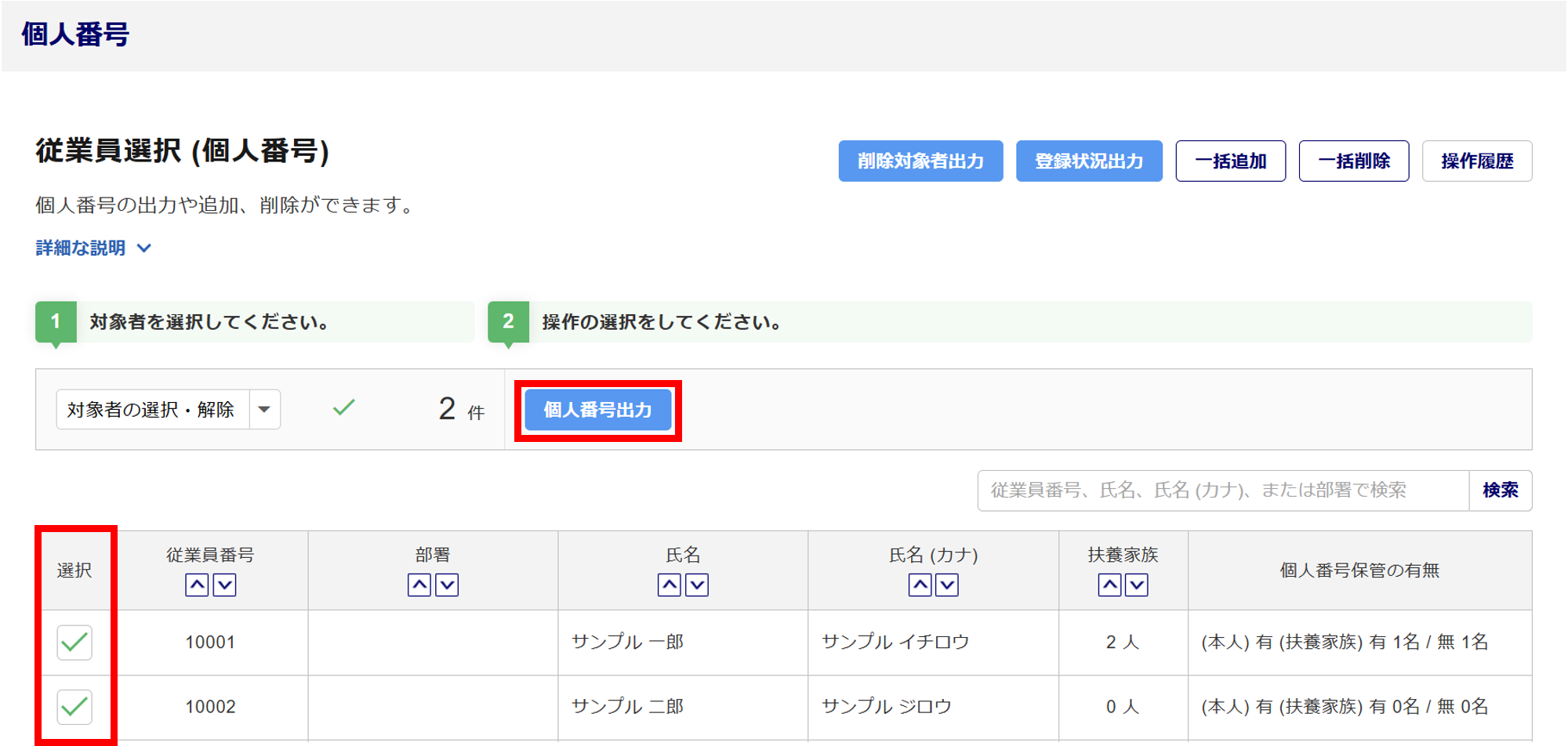 「個人支払先」とは - 登録済みの個人番号(マイナンバー)を全件出力する場合は、[個人番号出力]をクリックします。一部従業員の個人番号(マイナンバー)を出力する場合は、先に対象従業員の「選択」列にチェックします。