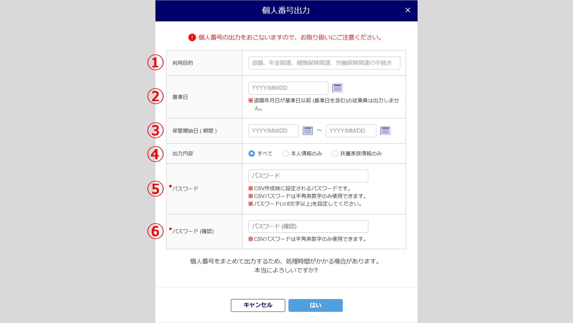 「個人番号出力」ウィンドウが表示されます。 - 各項目を設定して、[はい]をクリックします。