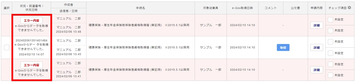 [送信一覧]の情報を確認時、[利用者登録・編集]に登録している情報に対して確認しており、電子申請時点の[利用者登録・編集]と異なる情報を登録していると、本メッセージが表示されます。