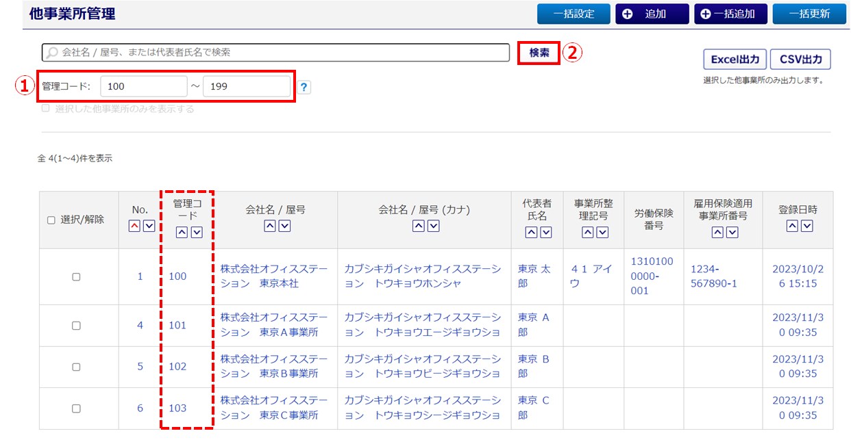 「他事業所管理」画面にて東京都の事業所のみを表示させたいとき、「管理コード」の最小値に「100」、最大値に「199」を入力し(①)、[検索](②)をクリックすると、東京都の事業所のみが一覧に表示されます。