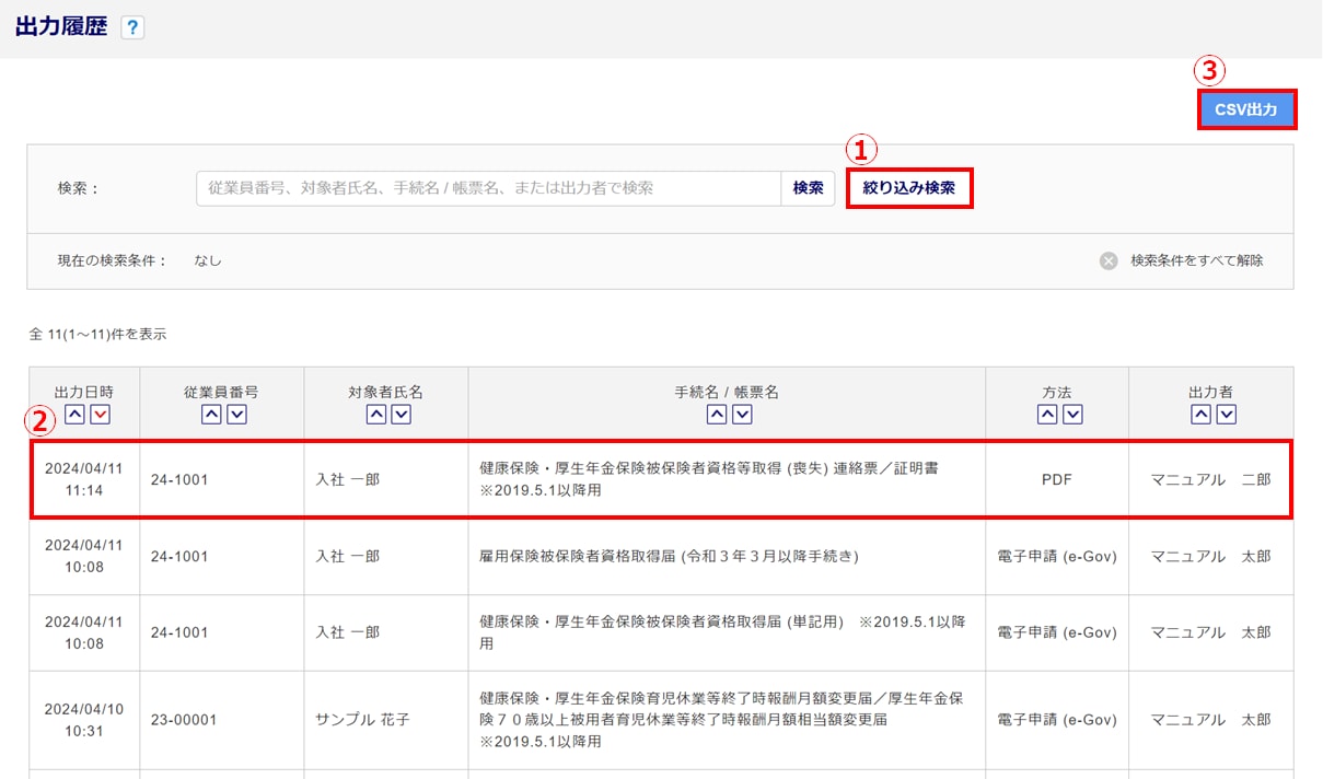 出力日時、手続種別、手続名/帳票名、対象者氏名、従業員番号、出力者名の条件を指定して絞り込み検索ができます。 - ②データ行