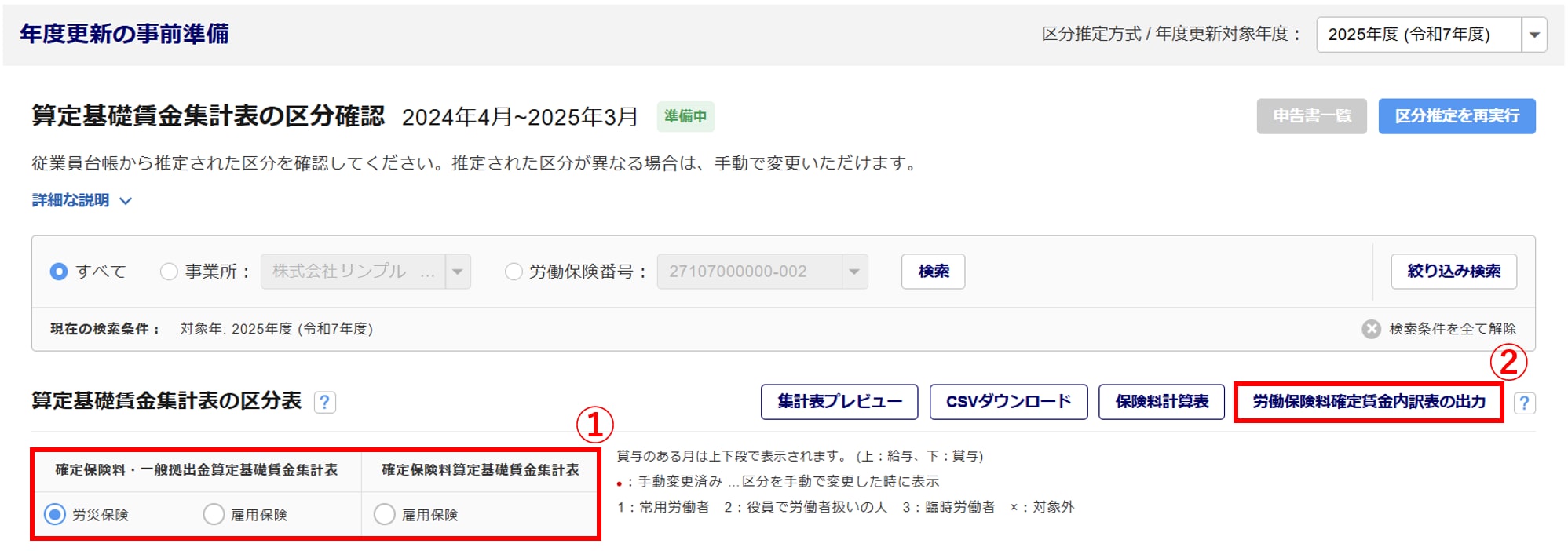 - 集計表の「種類」(①)を選択し、[労働保険料確定賃金内訳表の出力](②)をクリックします。