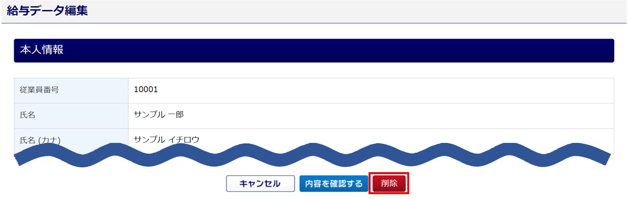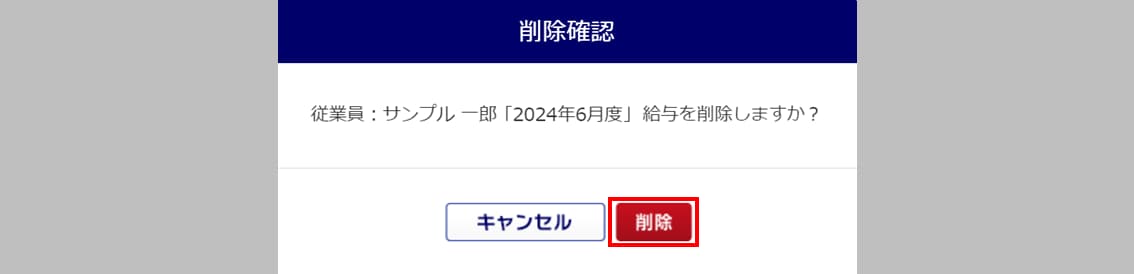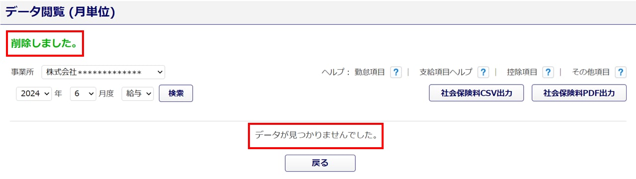 - 画面上部に「削除しました。」と表示され、給与データの削除は完了です。