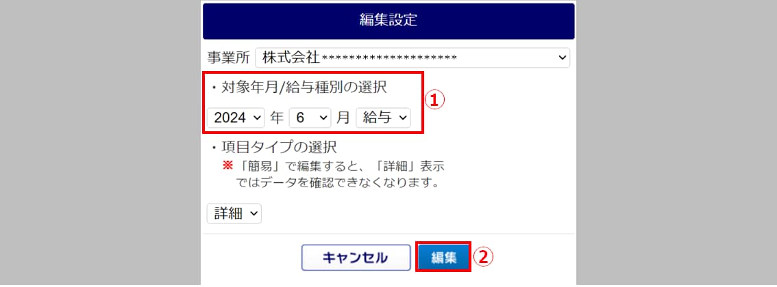- 「編集設定」ウィンドウが表示されます。「対象年月/給与種別の選択」に削除するデータの年月と種別を設定し(①)、[編集]をクリックします(②)。