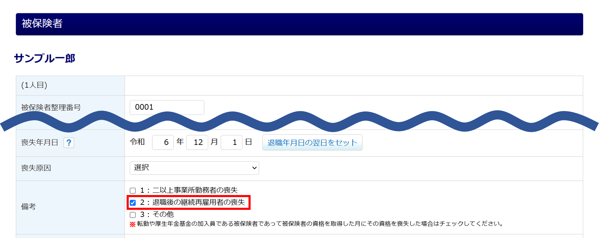 「備考」の「2:退職後の継続再雇用者の喪失」にチェックをつけます。