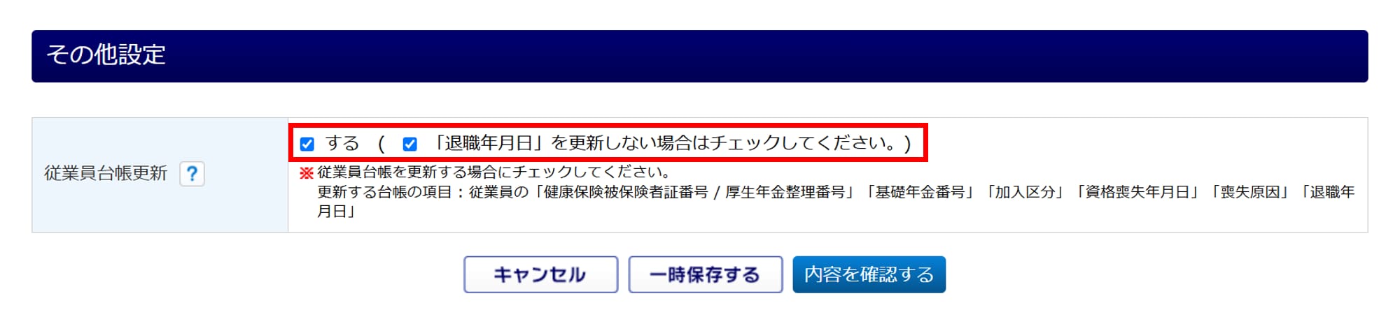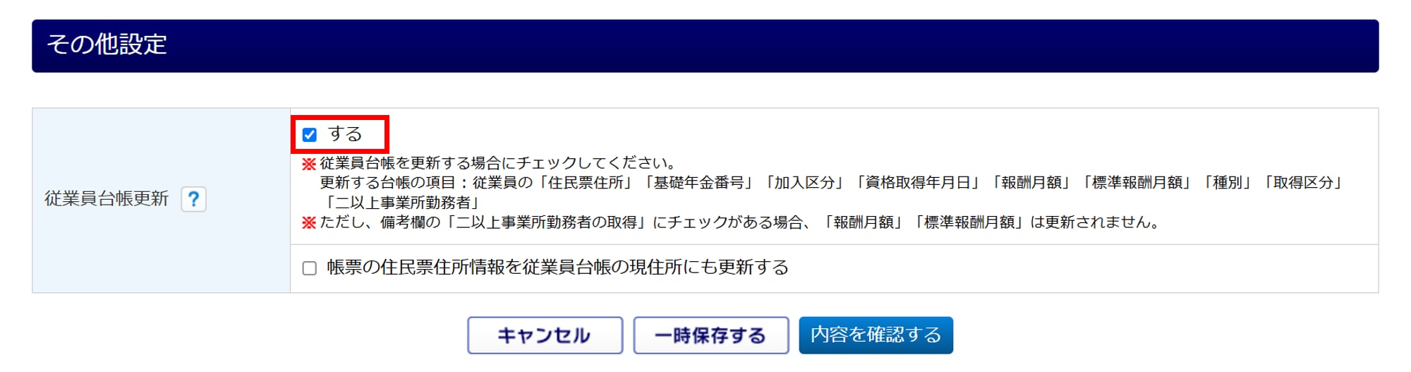 「従業員台帳更新:する」にチェックをつけます。
