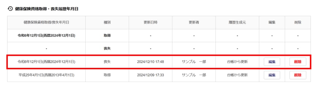 従業員詳細で「資格喪失年月日」の日付を削除しても、[履歴管理]に情報が残ります。