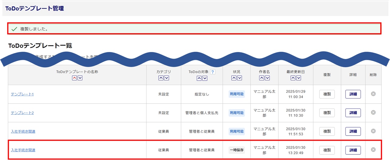 チェックしない場合、基準日や基準日を起点に期限を設定しているタスク、日付指定をしているタスクはすべて日付をそのままに複製します。 - 左上に「複製しました。」と表示され、複製したToDoリストが最下部に表示されていれば、操作は完了です。※複製した場合、「状況」は「一時保存」となります。