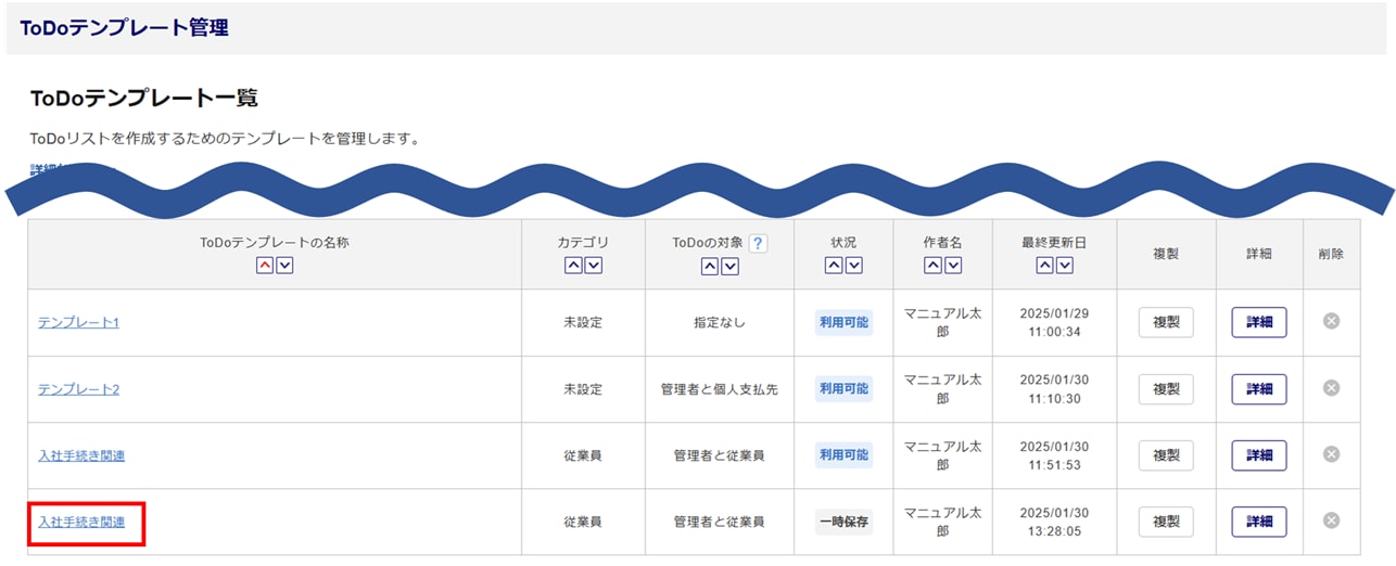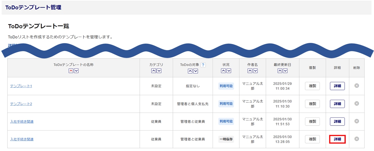- 対象のToDoテンプレートの[詳細]をクリックします。