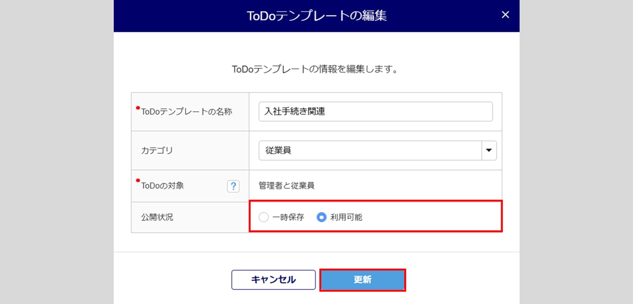- 「公開状況」に「利用可能」を選択し、[更新]をクリックします。「ToDoテンプレートの名称」「カテゴリ」も合わせて変更可能です。