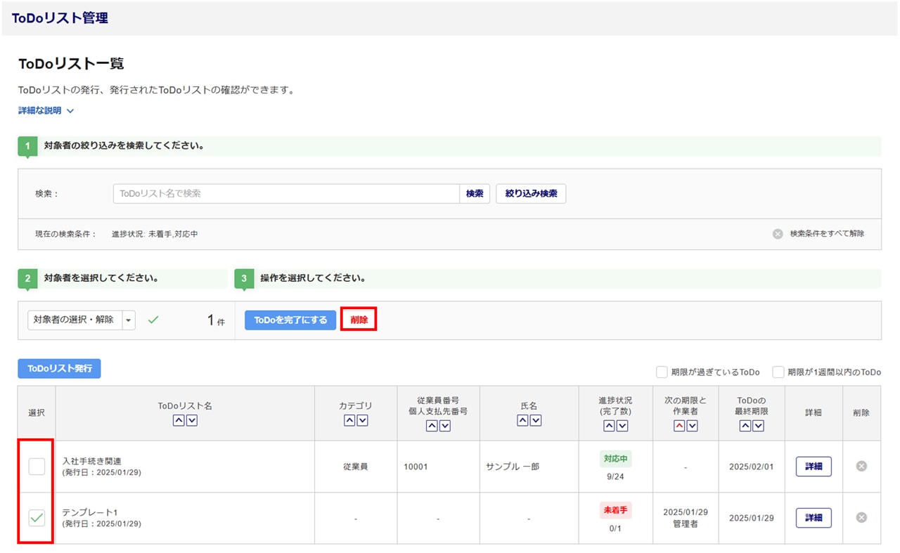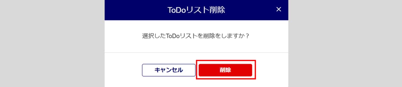 - 削除するToDoリストの「選択」列にチェックし、[削除]をクリックします。