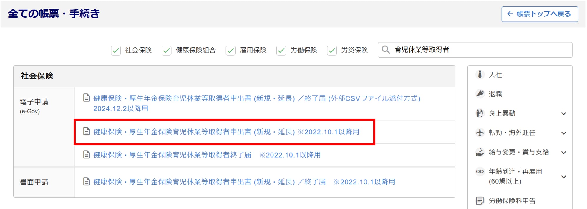 - [帳票]をクリックし、検索窓に帳票名または帳票名の一部を入力し[検索]をクリックします。または、[出産・育児・介護]をクリックします。