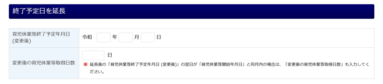 「育児休業期間(開始)」「育児休業期間(終了)」「育児休業期間中の休業取得日数」 - 延長の場合