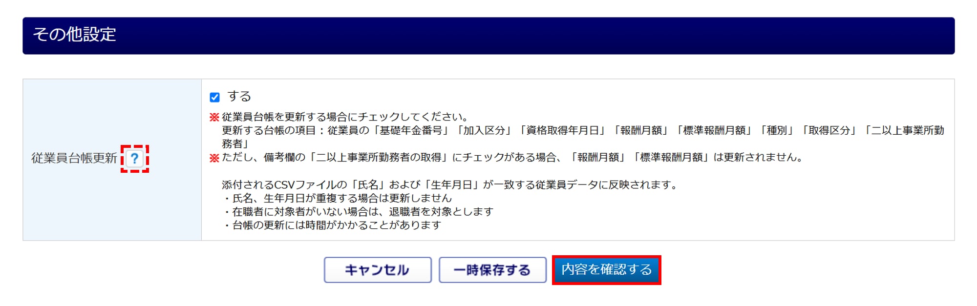 「従業員台帳更新」の「する」にチェックすると、申請時に添付したCSVの情報を従業員台帳へ更新することができます。更新対象項目については、以下の補足をご確認ください。