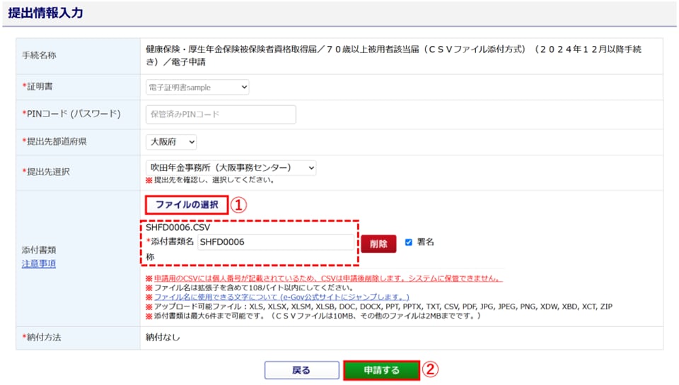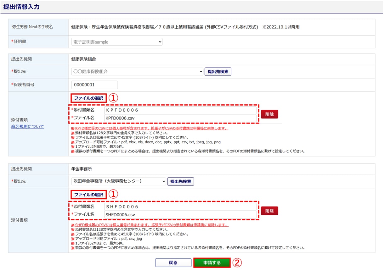 提出情報入力「添付書類」の[ファイルの選択](①)をクリックし、作成したCSVファイルを添付します。ファイル添付後、[申請する](②)をクリックします。