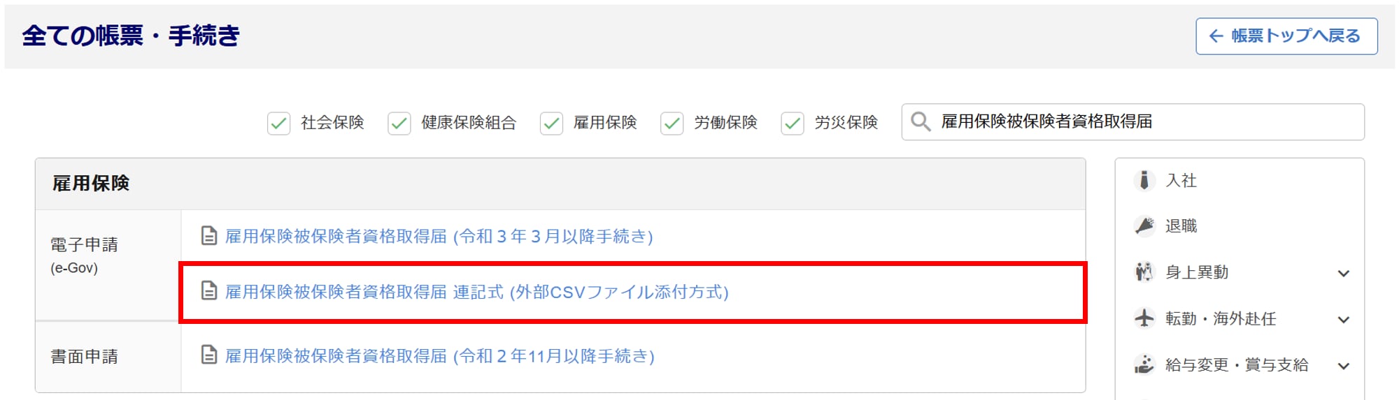 - 電子申請(e-Gov)欄の[雇用保険被保険者資格取得届 連記式(外部CSVファイル添付方式)]をクリックします。