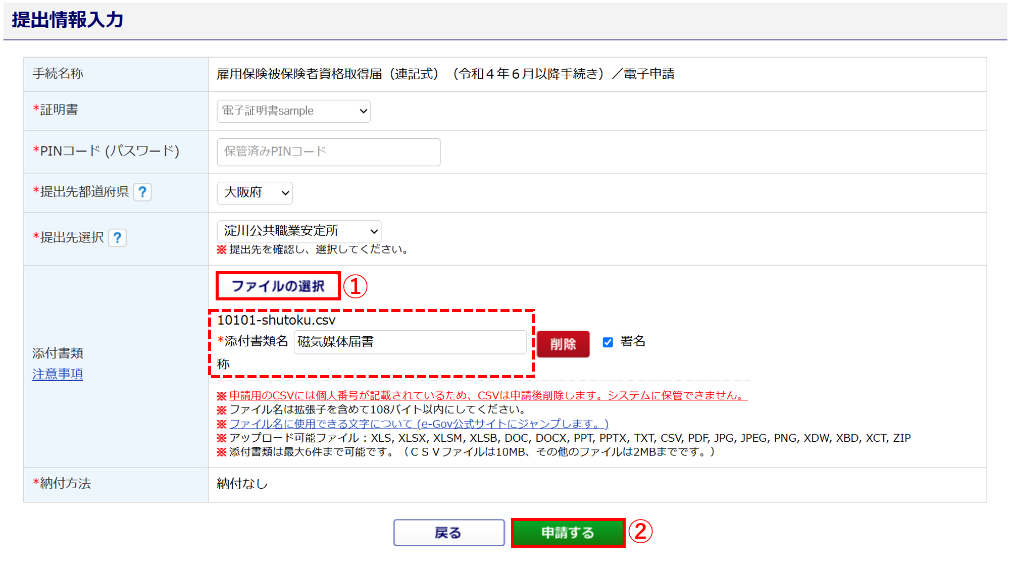 提出情報入力「添付書類」の[ファイルの選択](①)をクリックし、作成したCSVファイルを添付します。ファイル添付後、[申請する](②)をクリックします。