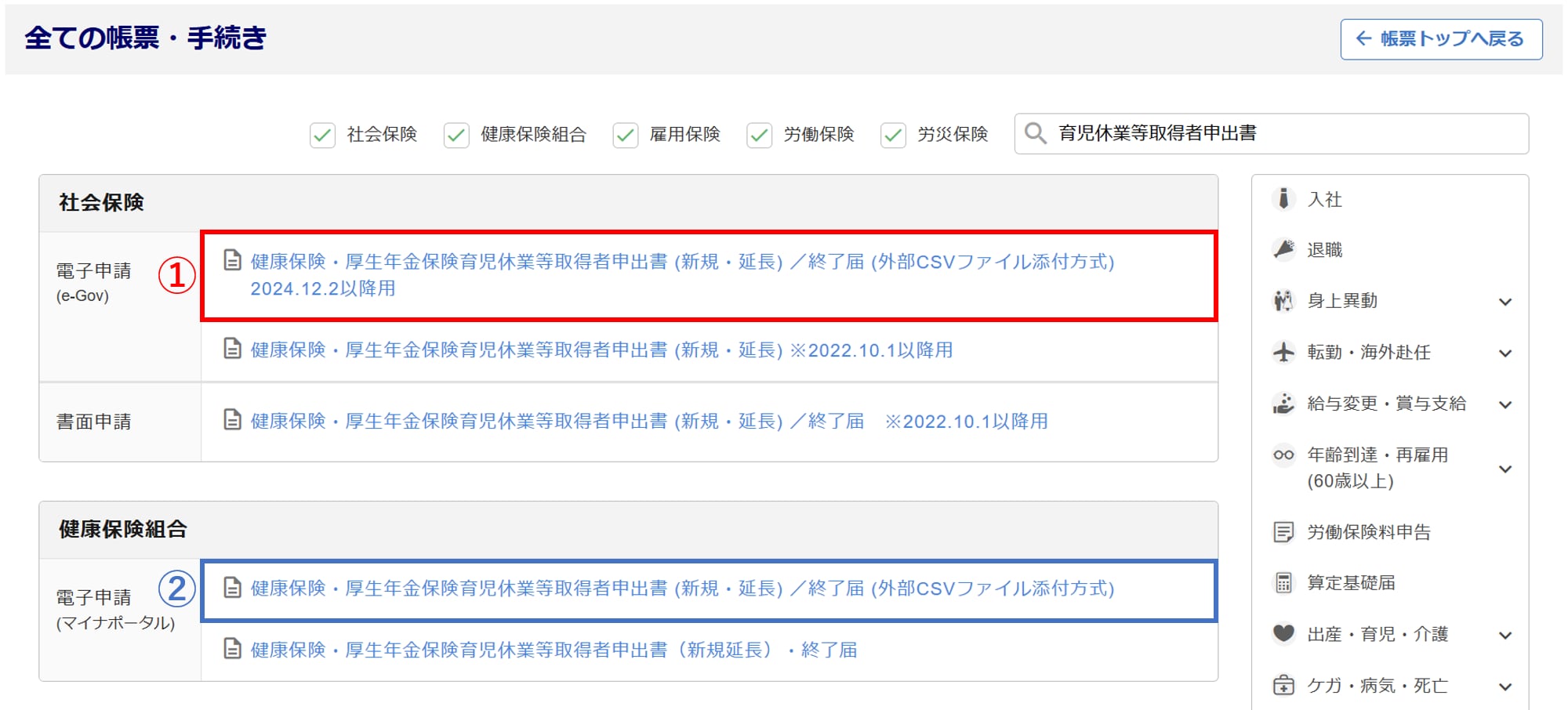 電子申請(e-Gov)欄の[健康保険・厚生年金保険育児休業等取得者申出書(新規・延長)/終了届(外部CSVファイル添付方式)※2024.12.2以降用](①)をクリックします。 - マイナポータル経由で提出する場合