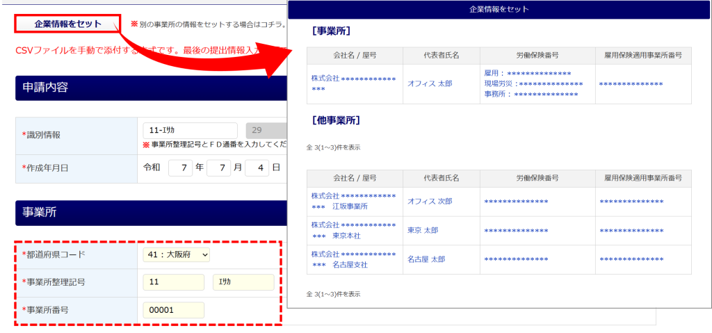 ※事業所整理記号の情報は、「企業設定」の「社会保険事業所整理記号(電子申請CSV添付方式用)」を引用しています。