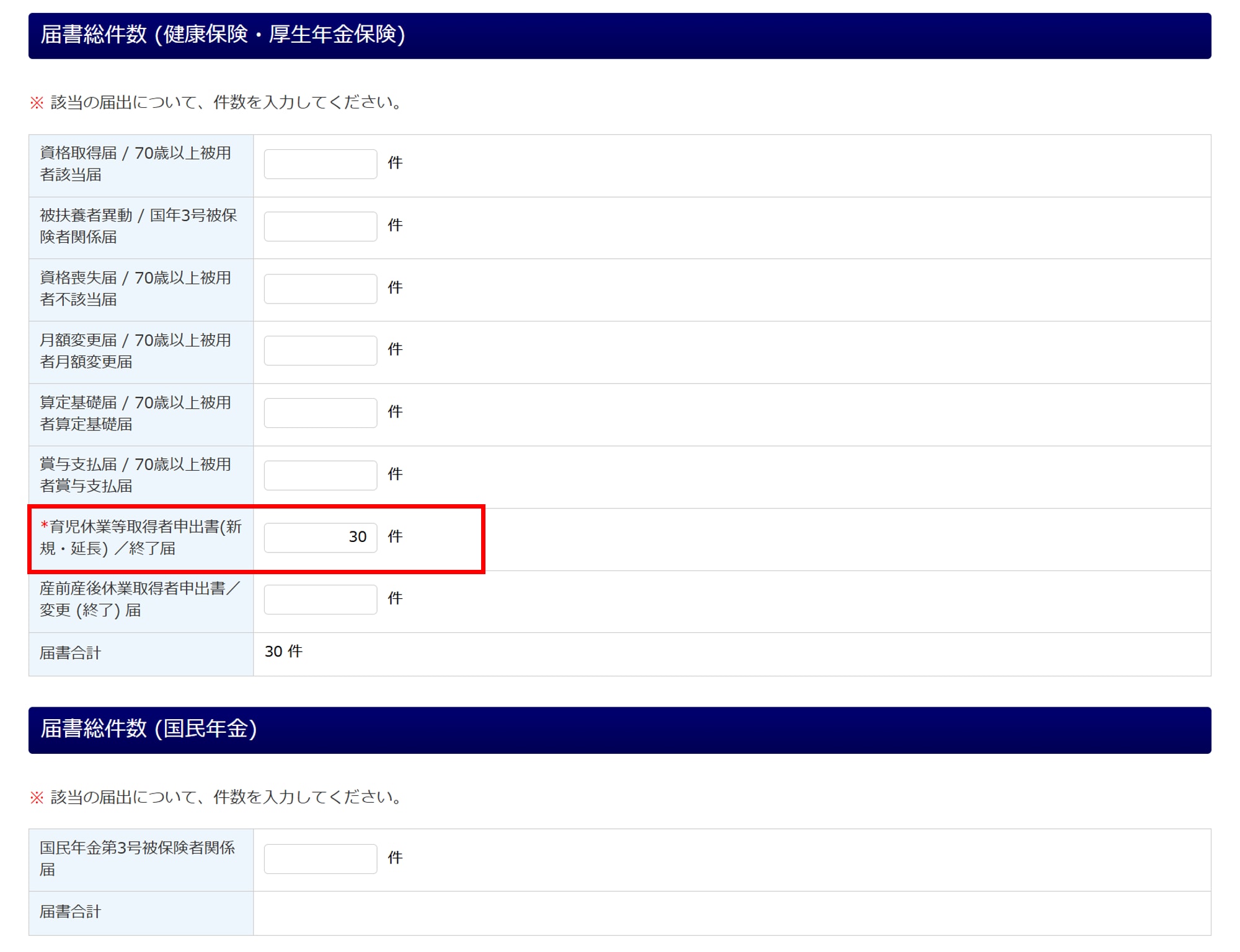 「育児休業等取得者申出書(新規・延長)/終了届」に申請する被保険者数を入力します。