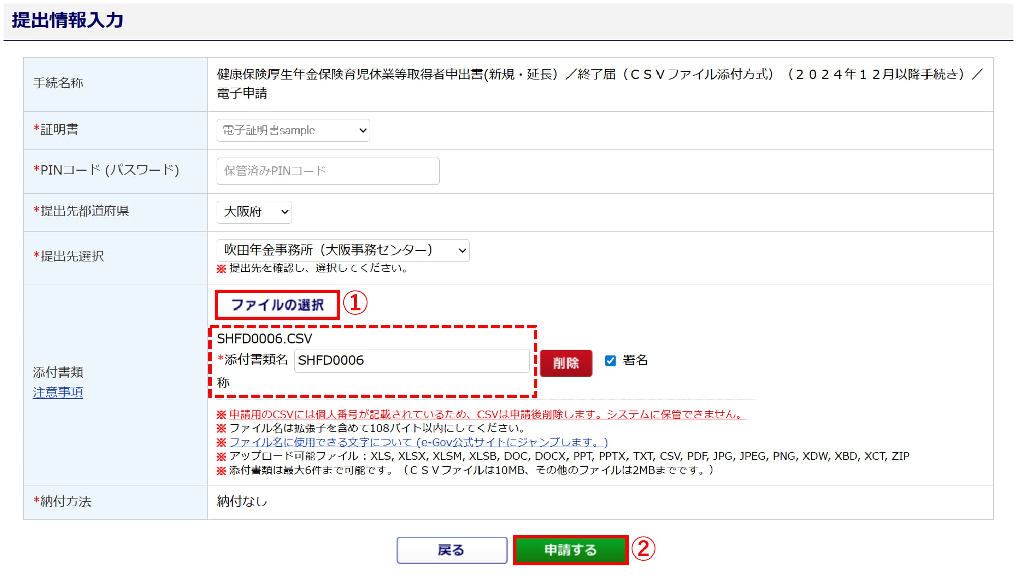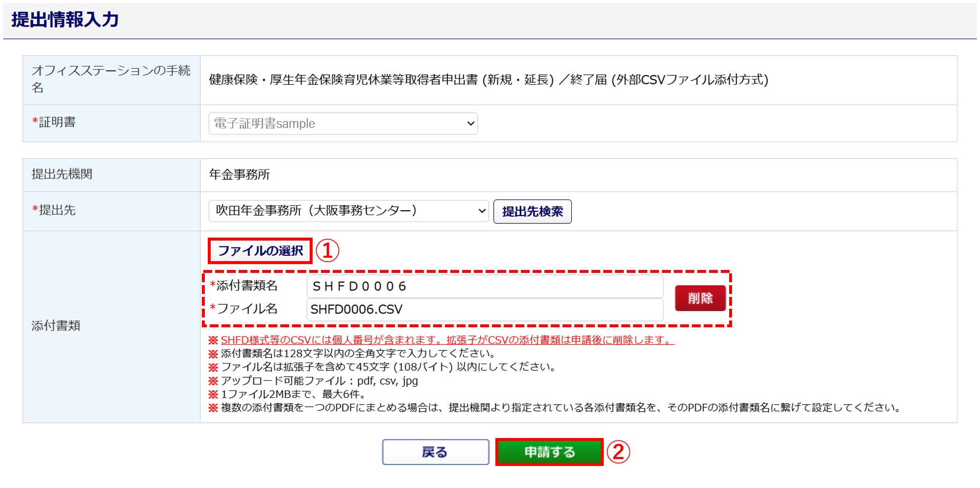 提出情報入力「添付書類」の[ファイルの選択](①)をクリックし、作成したCSVファイルを添付します。ファイル添付後、[申請する](②)をクリックします。