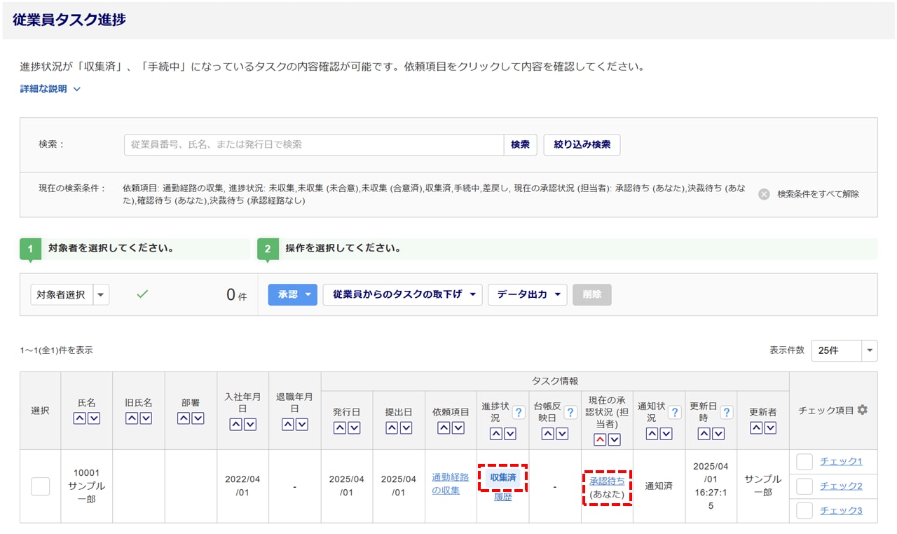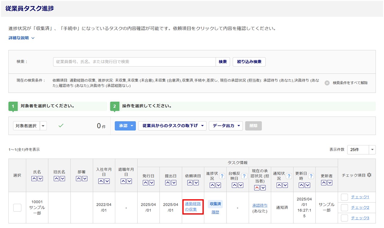 メインページ「未完了タスク一覧」内「通勤経路の収集」の件数部分(ここでは[1件])をクリックすると、次の「従業員タスク進捗」画面で、「通勤経路の収集」タスクを絞り込んだ状態で一覧に表示されます。