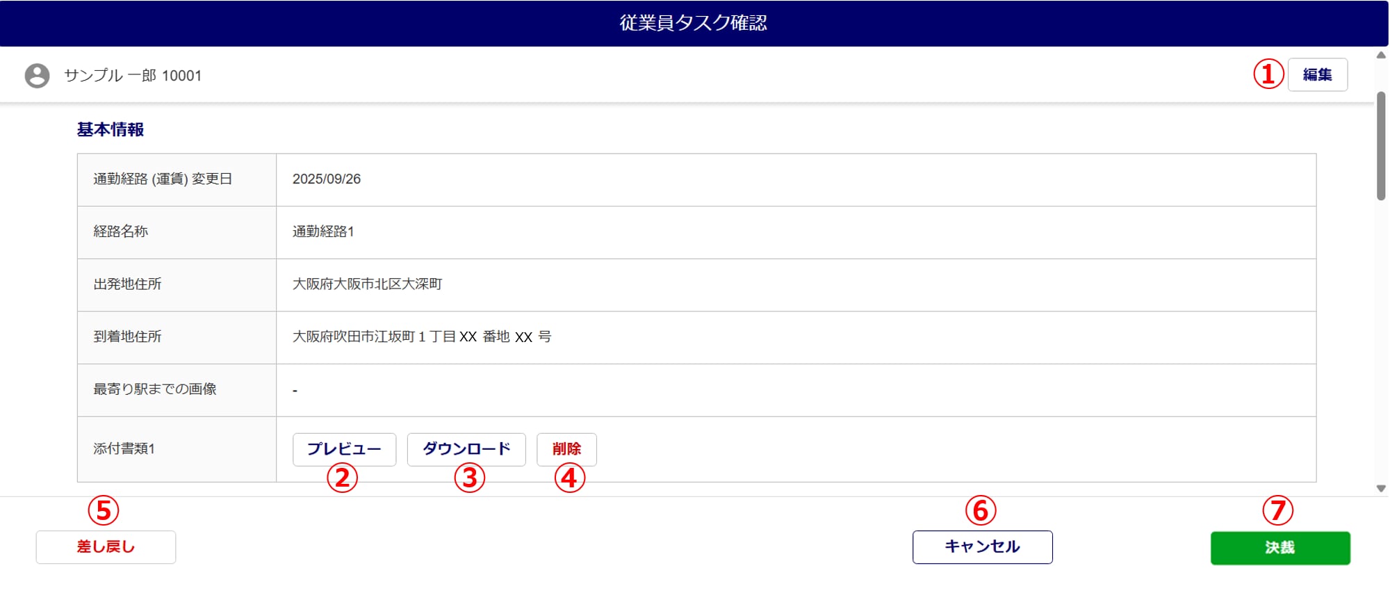 | ④ | 削除* | 最寄り駅までの画像、添付書類の画像を削除します。 ※「決裁」時、「管理者」権限の利用者のみ表示されます。 |
