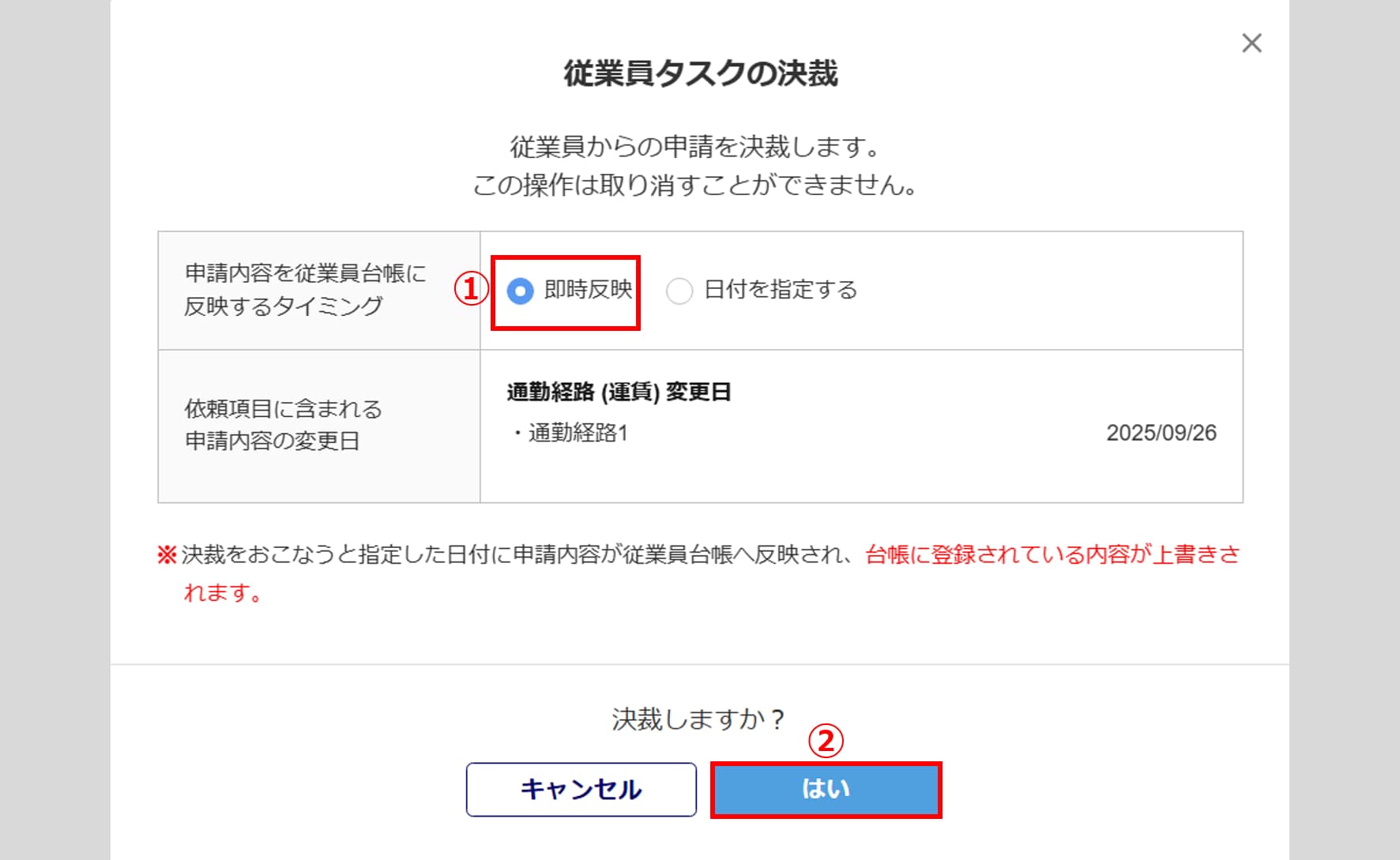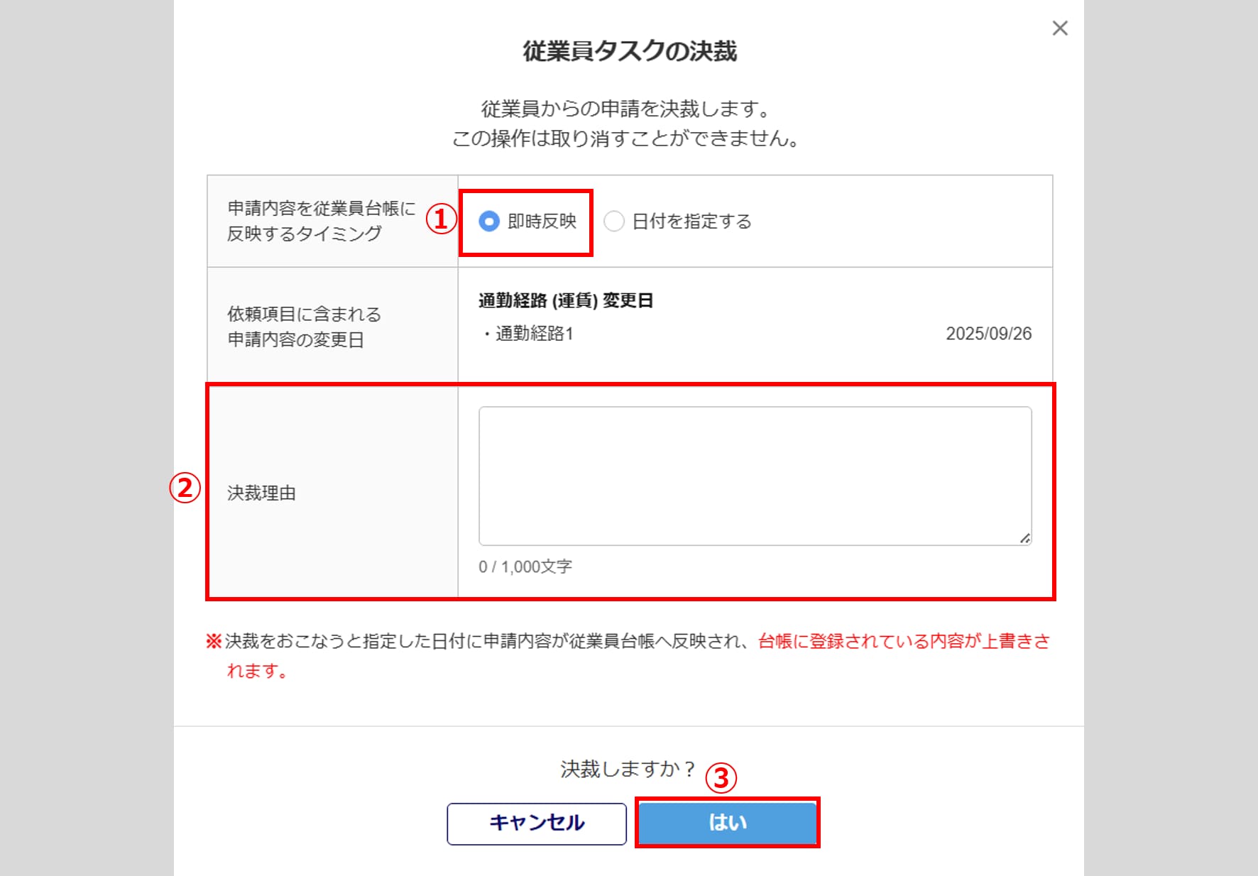 「申請内容を従業員台帳に反映するタイミング」に「即時反映」(①)を選択し、「決裁理由」(②)を入力、[はい](③)をクリックします。「決裁理由」の入力は任意です。「決裁」をおこなうと、従業員台帳に通勤経路情報の内容が即時反映されます。