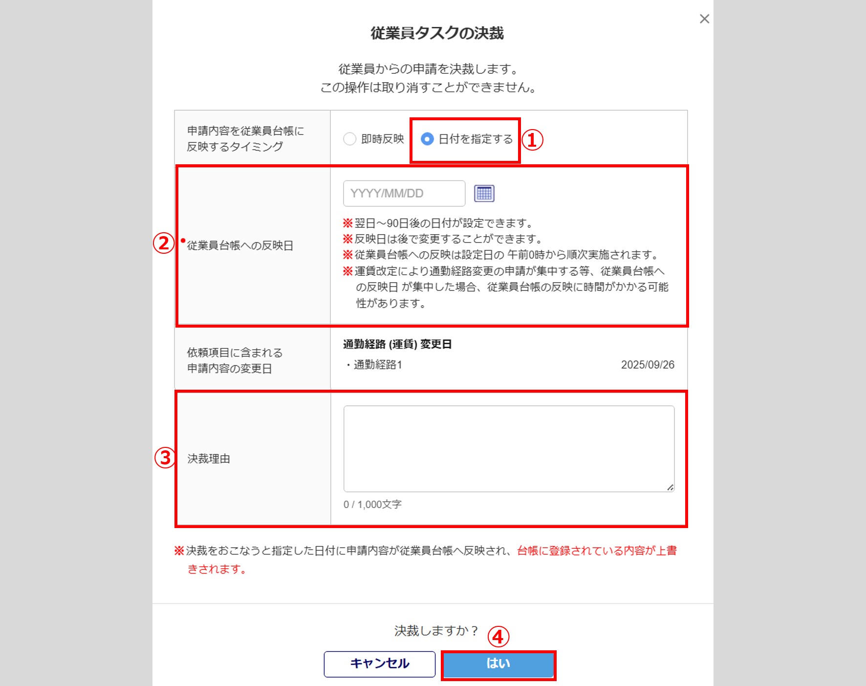 「決裁理由」(③)を入力し、[はい](④)をクリックします。「決裁理由」の入力は任意です。- 「従業員台帳の反映日」には、翌日から90日後の日付が設定可能です。