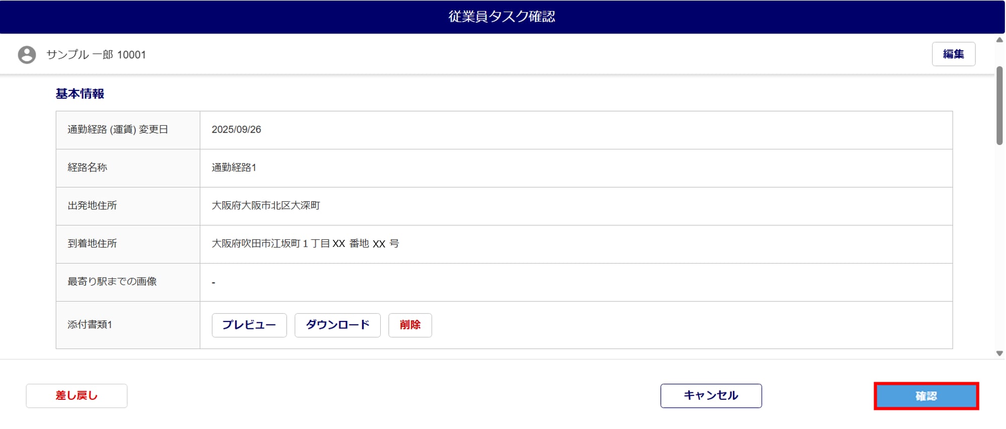 *:[マスタ管理]>[マイページ管理]>[マイページ設定]にて、「通勤経路」を「必要」と設定しており従業員から画像の提出がある場合に表示されます。