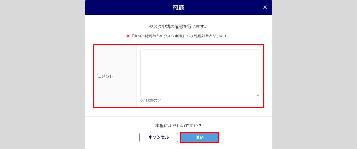 「承認理由」を入力し、[はい]をクリックします。「承認理由」の入力は任意です。