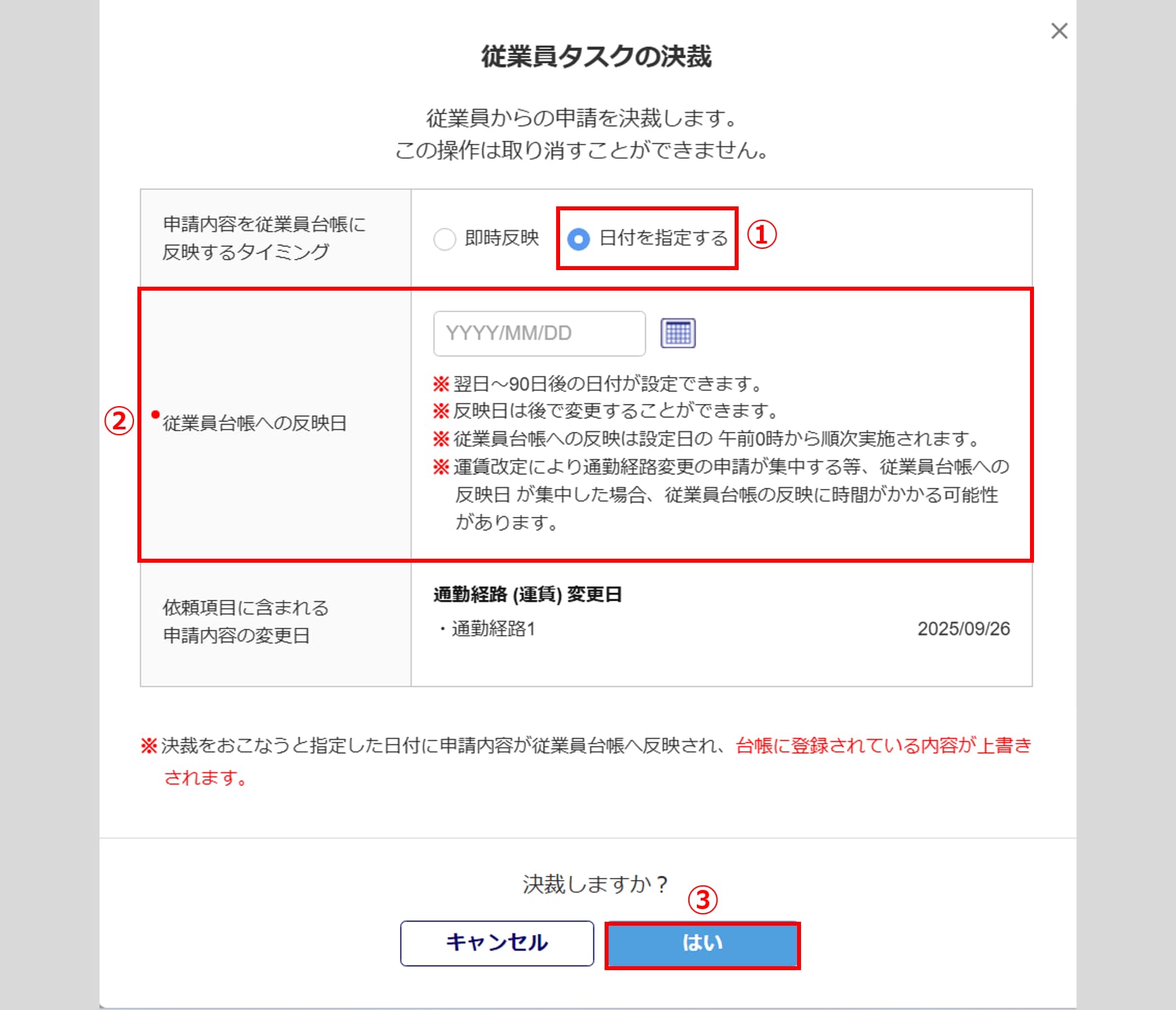 「申請内容を従業員台帳に反映するタイミング」に「日付を指定する」(①)を選択し、「従業員台帳への反映日」(②)を入力します。[はい](③)をクリックします。- 「従業員台帳の反映日」には、翌日から90日後の日付が設定可能です。