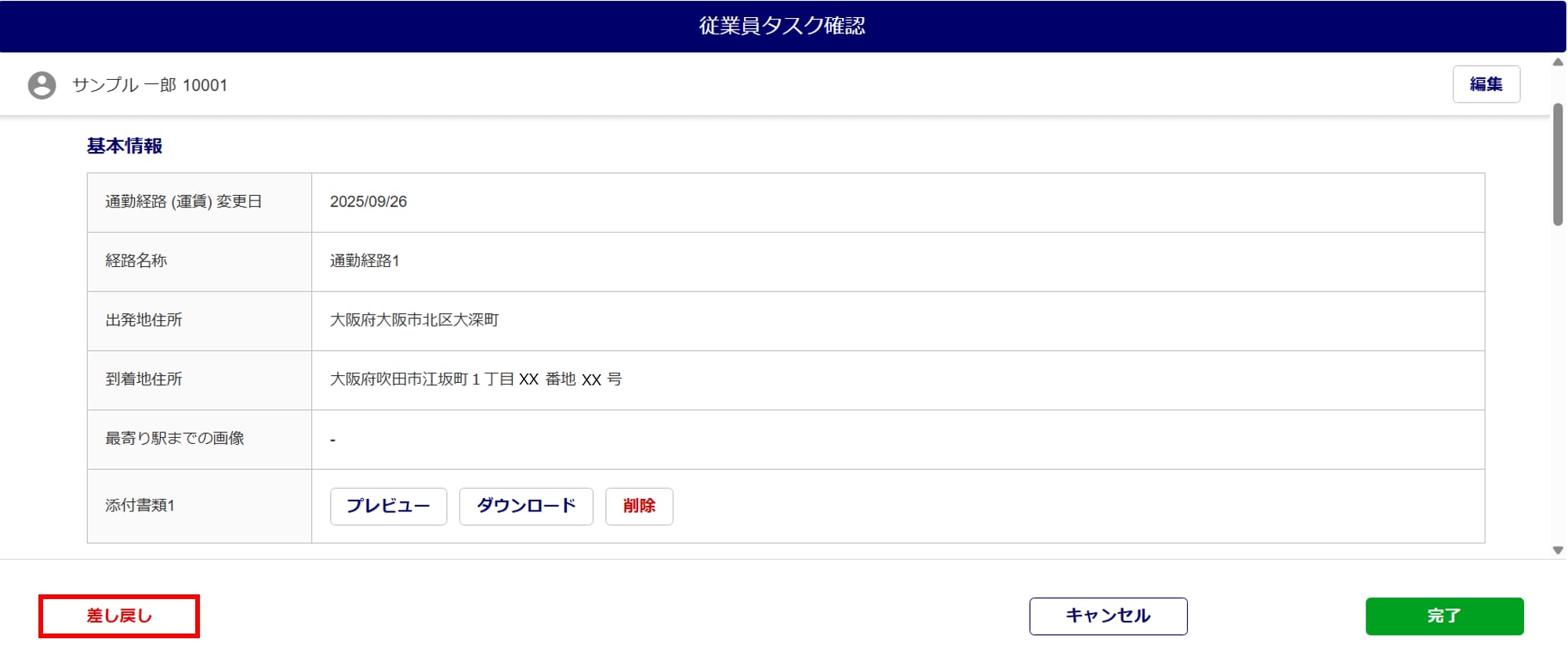 従業員から提出された内容に不備があり、従業員本人に情報の修正を依頼する場合は、差し戻しをおこないます。