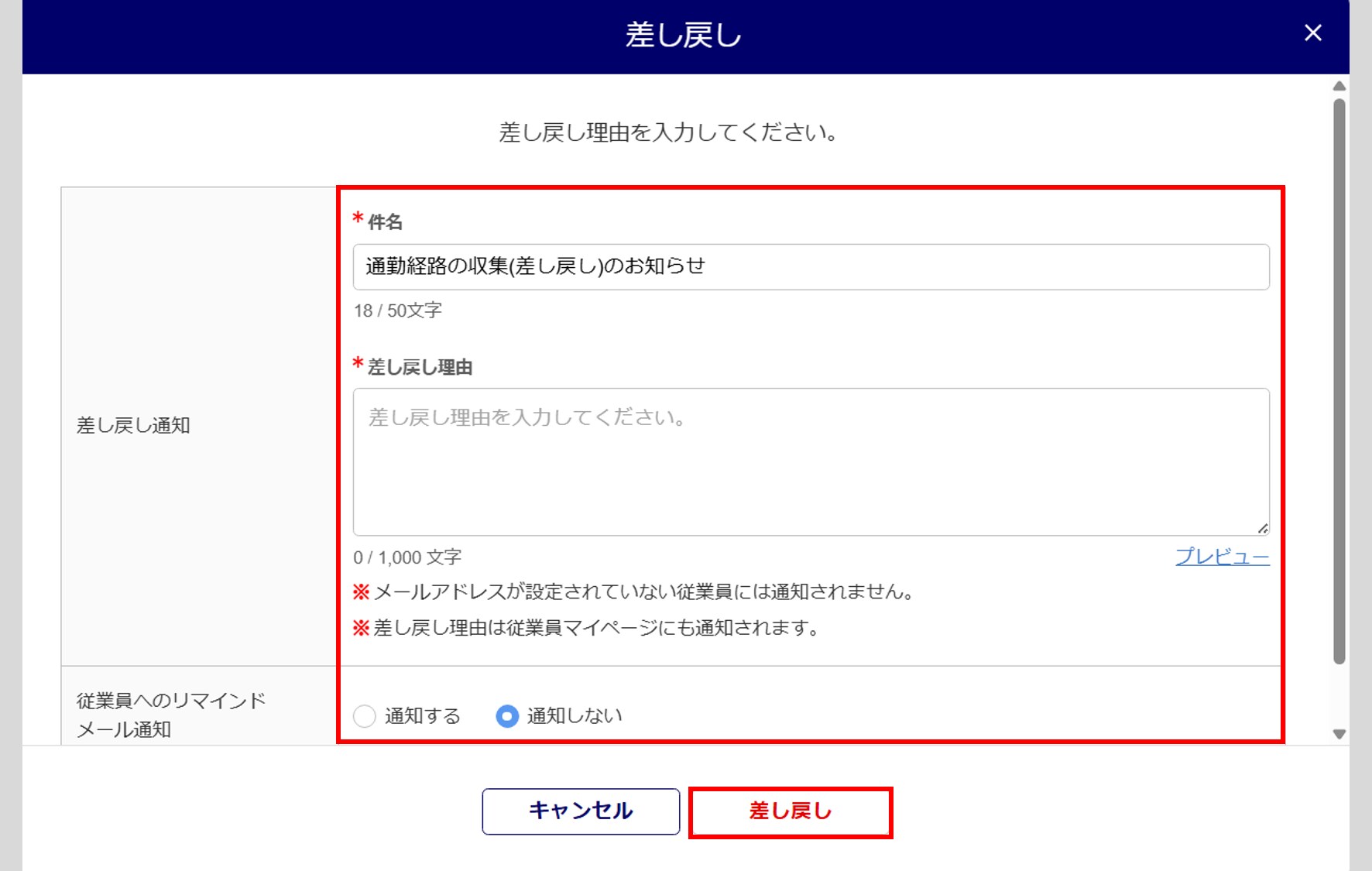 「差し戻し通知」「従業員へのリマインドメール通知」を設定し、[差し戻し]をクリックします。