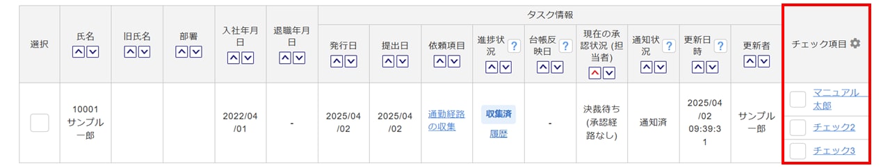- 従業員からタスク提出済みの場合、「進捗状況」列に「収集済」と表示されます。※「進捗状況」列の[?(はてなマーク)]をクリックすると、進捗状況について詳細を確認できます。