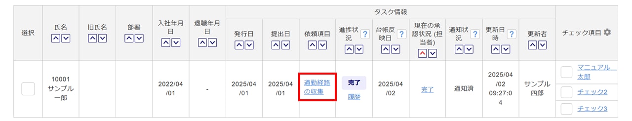 - 「依頼項目」列の[通勤経路の収集]をクリックします。