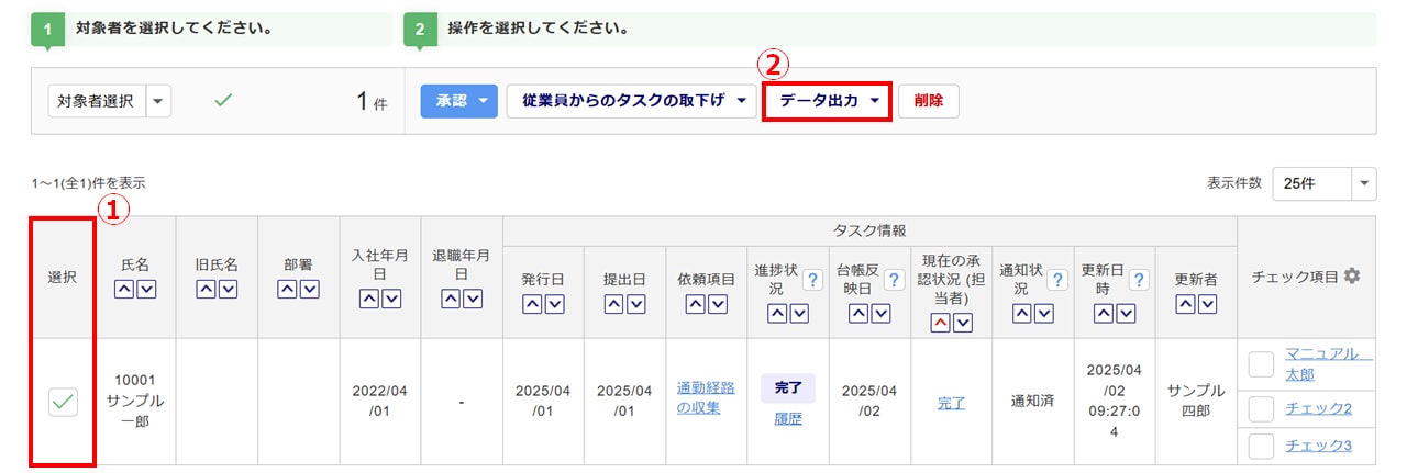 出力対象の「選択」列(①)にチェックし、[データ出力](②)をクリックします。