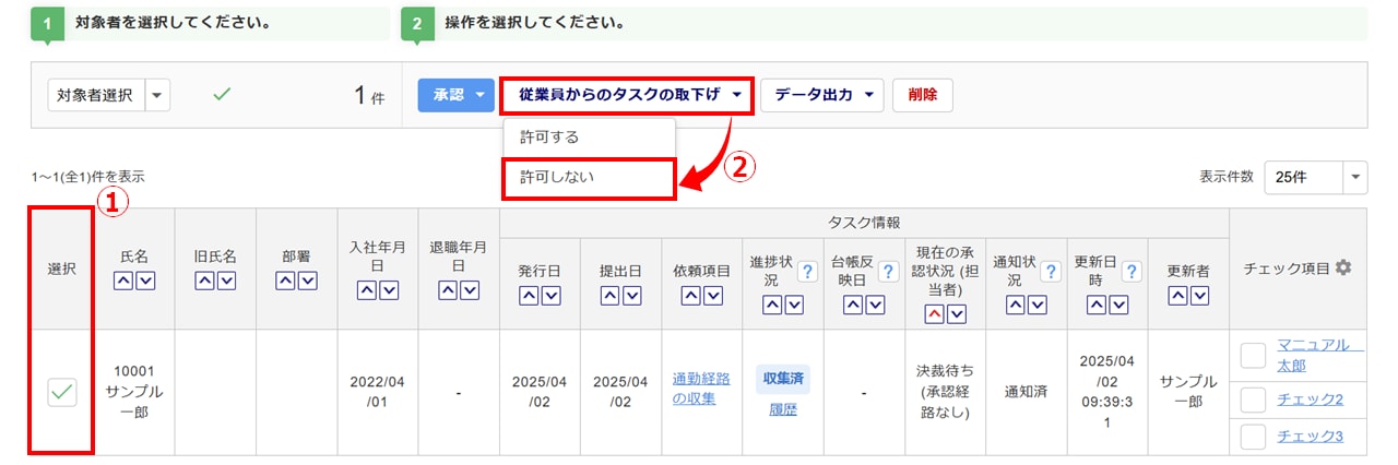 取下げを不可にする従業員の「選択」列(①)にチェックし、[従業員からのタスクの取下げ]>[許可しない](②)をクリックします。