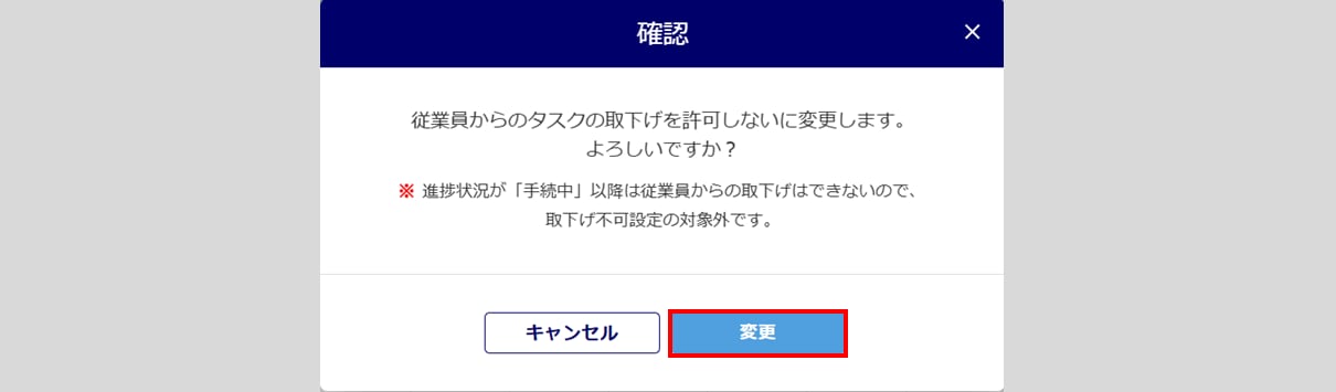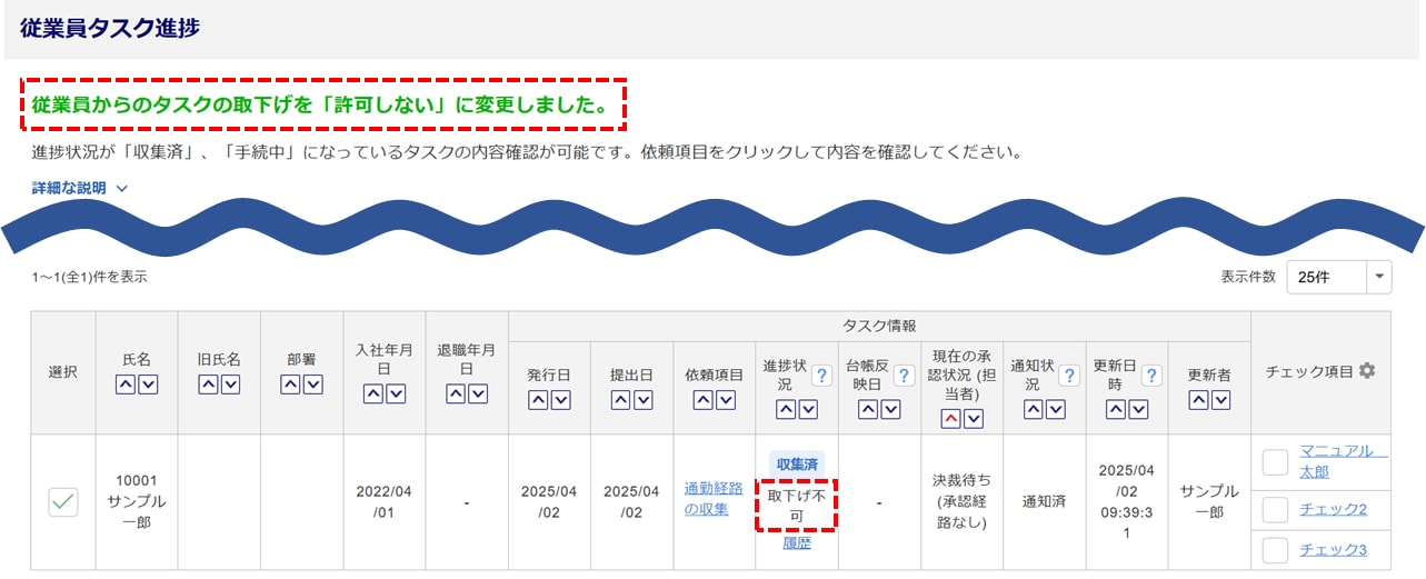 画面上部に「従業員からのタスクの取下げを「許可しない」に変更しました。」と表示され、「進捗状況」列に「取下げ不可」と表示されたら、タスク取下げの設定は完了です。