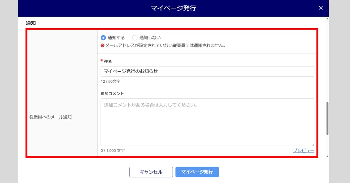 - メールアドレスの登録がある従業員にマイページ発行のお知らせを通知します。